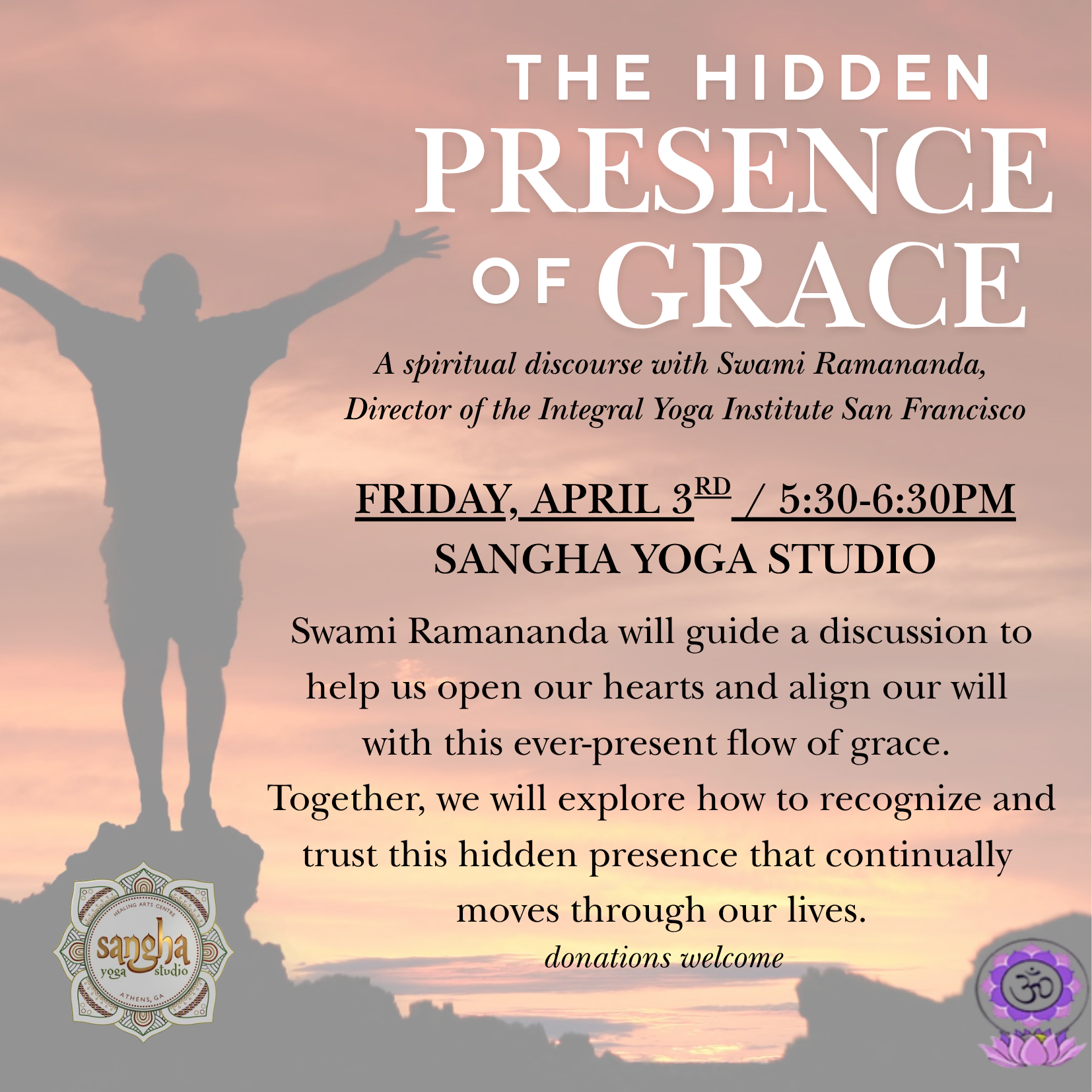 Swami Ramananda will guide a discussion to help us open our hearts and align our will with this ever-present flow of grace. Together, we will explore how to recognize and trust this hidden presence that continually moves through our lives. All are wholeheartedly welcome and no reservation is necessary. Inspiration for the whole family.